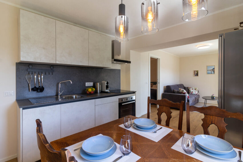 Diese stilvoll und in 2025 komplett neu renovierte Ferienwohnung in Vesio di Tremosine bietet Platz für zwei bis vier Personen. Lichtdurchfluteter Wohn-/Essbereich mit moderner, voll ausgestatteter Küche (Spülmaschine und Backofen), Esstisch und Schlafsofa (190×160), Sat-TV und Wi-Fi.